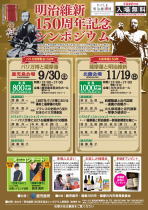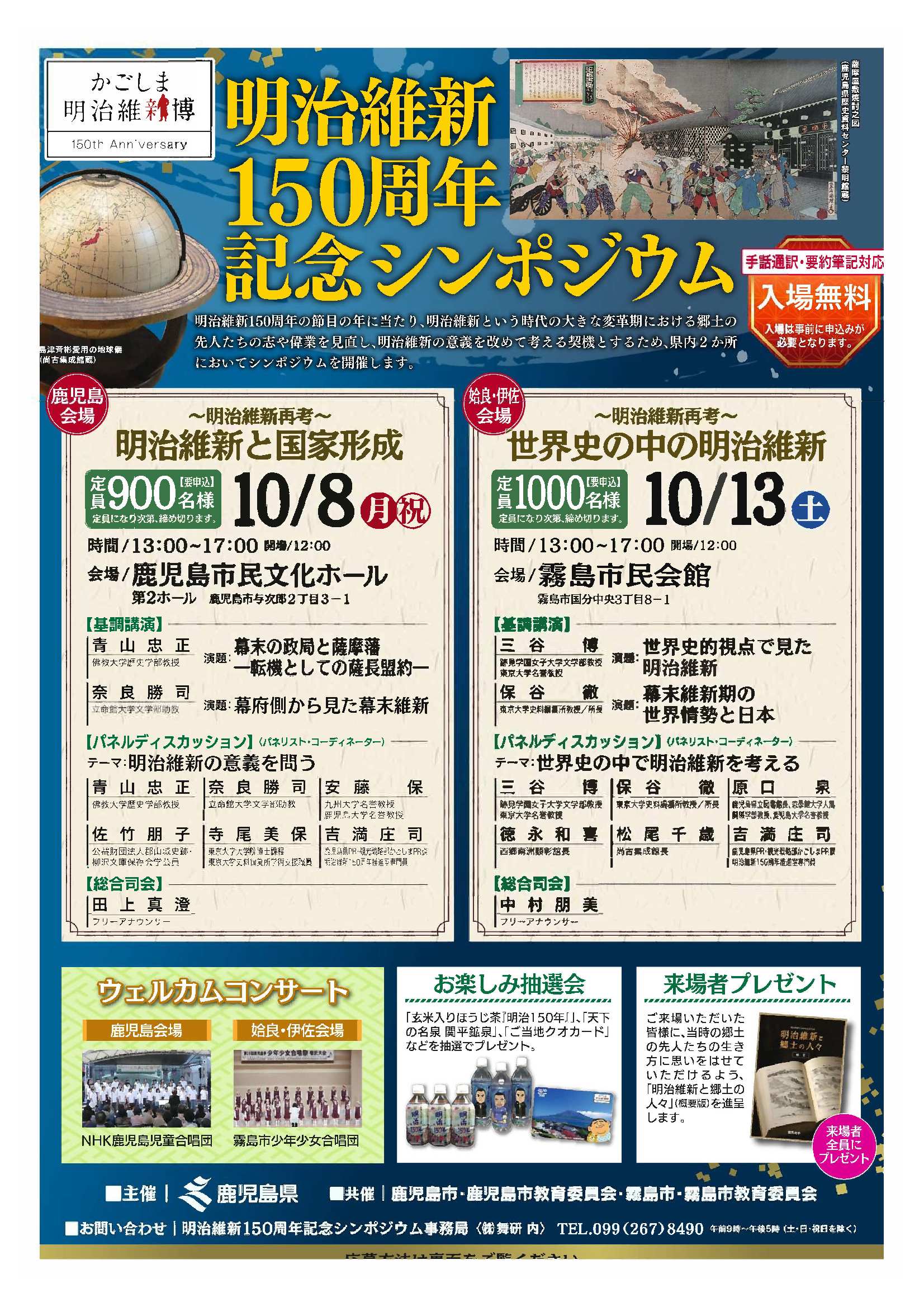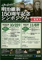 シンポジウム 明治維新150周年記念シンポジウム 鹿児島会場 日時:平成28年10月22日(土) 場所:鹿児島市民文化ホール(第2ホール) 鹿屋会場 日時:平成28年11月6日(日) 場所:鹿屋市民交流センター 参考URL:https://www.pref.kagoshima.jp/aa03/kensei/sesaku/m150sympo.html |