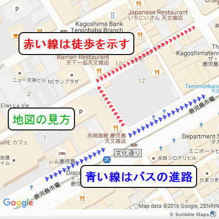また、鹿児島中央駅前から発着しているバスは、天文館経由で運行しているものが非常に多いですので、鹿児島中央駅から天文館に行く場合は、駅前のバス停から「天文館経由」と書かれているバスに乗車するか、もしくは市電(路面電車)の「鹿児島中央駅前」電停から「鹿児島駅前行き」に乗り、「天文館通」電停で下車して下さい。