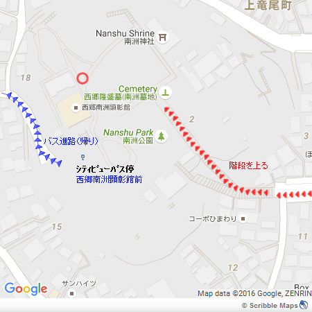 ただし、西郷洞窟前を出発したバスが、山上で再び折り返して戻ってくる所要時間は、約5分程度です。ものすごく慌ただしく洞窟を見学しなくてはなりませんが、この方法を使えば、時間のロスなく、次の史跡へと向かうことが出来ます。(地図9参照)