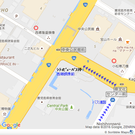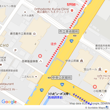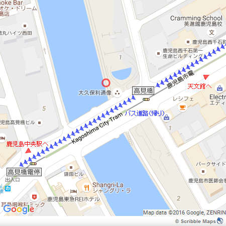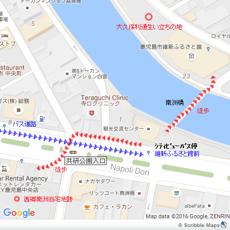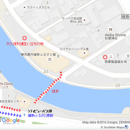 「維新ふるさと館(観光交流センター)前」のバス停は、甲突川を挟んだ対岸、「ナポリ通り」と呼ばれる道路沿いに移転していますので(地図2参照)、過去に鹿児島を訪れたことのある方は注意してください。