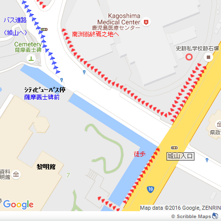 お城の堀の切れ目に交差点があり、信号を渡ると、西郷隆盛が創設した『私学校跡』の石碑が見えてきます。石塀が連なっているところですので、近づけばすぐに分かると思います。