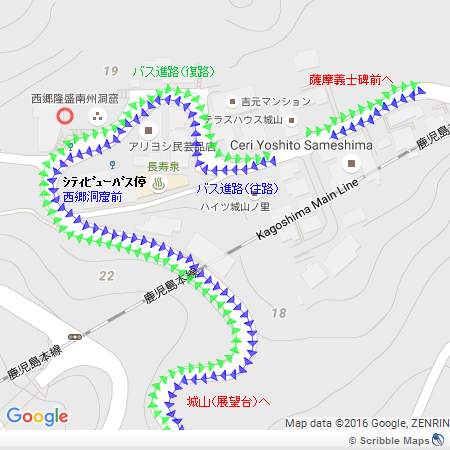 シティビューは、「薩摩義士碑前」から城山の山上を目指して走りますが、その間に「西郷洞窟前」というバス停に停車し、最終的に城山の展望台へと向かいます。そして、展望台に着いたバスは、そこから折り返し、また「西郷洞窟前」へと下って戻ってきます。
