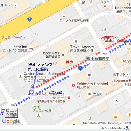 「ザビエル公園前」バス停から目的地の照国神社までは、徒歩で約5〜6分程度です。