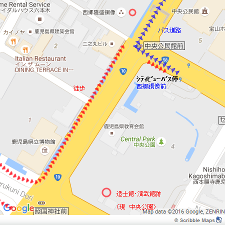 照国通りに出ると、左手に大きな鳥居が見えるところまで説明しましたが、その鳥居に向かって歩いて行く途中、右手に「中央公園」という大きな公園があります。ここは薩摩藩政時代、『造士館』と『演武館』という藩校があった場所です。