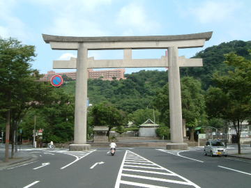 シティビューを下車し、バスの進行方向へと真っ直ぐに歩いて行くと、二つ目の信号で道幅の大きな広い道へと出ます。これが照国神社へと続く「照国通り」と呼ばれている道路です。この交差点を左へ曲がると、正面に大きな鳥居が見えますが、これが照国神社前の大鳥居です。(地図13、14参照)